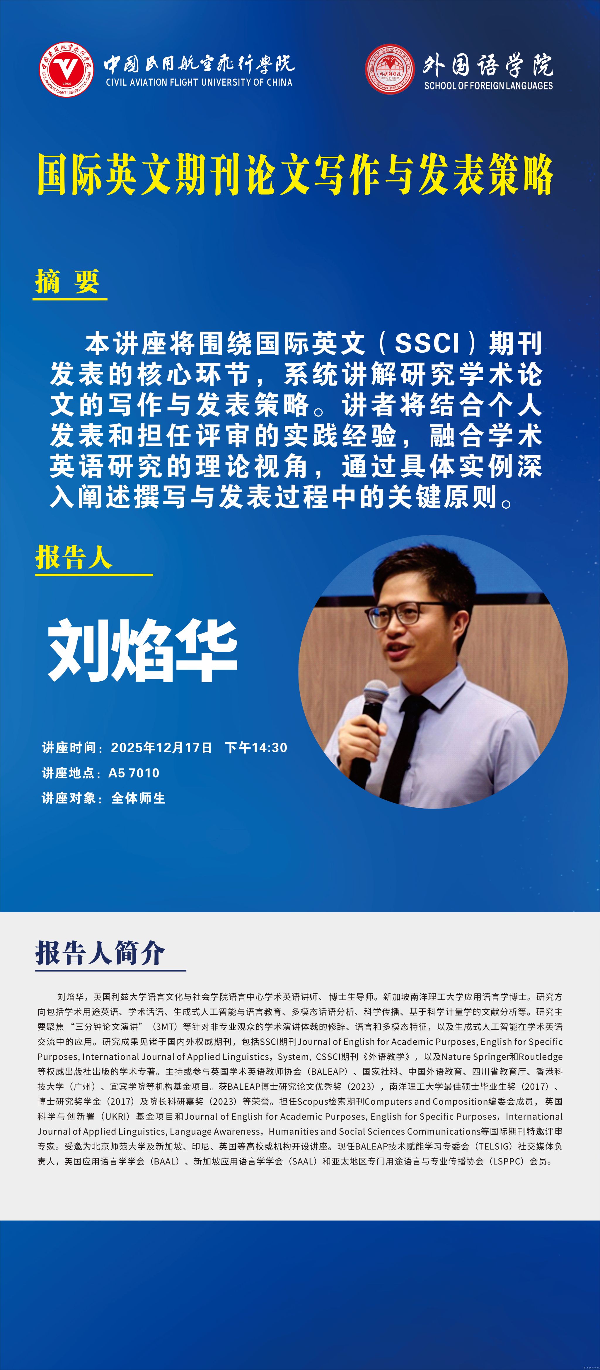 报告人简介:刘焰华,英国利兹大学语言文化与社会学院语言中心学术英语讲师、博士生导师。新加坡南洋理工大学应用语言学博士,研究方向包括学术用途英语、学术话语、生成式人工智能与语言教育、多模态话语分析、科学传播、基于科学计量学的文献分析等。研究主要聚焦“三分钟论文演讲”(3MT)等针对非专业观众的学术演讲体裁的修辞、语言和多模态特征,以及生成式人工智能在学术英语交流中的应用。研究成果见诸于国内外权威期刊,包括SSCl期刊Journal of English for Academic Purposes,English for Specific Purposes,lnternational Journal of Applied Linguistics, System, CSSCI期刊《外语教学》,以及Nature Springer和Routledge等权威出版社出版的学术专著。主持或参与英国学术英语教师协会(BALEAP)、国家社科、中国外语教育、四川省教育厅、香港科技大学(广州)、宜宾学院等机构基金项目。获BALEAP博士研究论文优秀奖(2023),南洋理工大学最佳硕士毕业生奖(2017)博士研究奖学金(2017)及院长科研嘉奖(2023)等荣誉。担任Scopus检索期刊Computers and Conmposition编委会成员,英国科学与创新署(UKRI)基金项目和Journal of English for Academic Purposes,English for Specific Purposes,International Journal of Applied Linguistics, Language Awareness, Humanities and SocialSciences Communications等国际期刊特邀评审专家。受邀为北京师范大学及新加坡、印尼、英国等高校或机构开设讲座。现任BALEAP技术赋能学习专委会(TELSIG)社交媒体介责人,英国应用语言学学会(BAAL)、新加坡应用语言学学会(SAAL)和亚太地区专门用途语言与专业传播协会(LSPPC)会员。