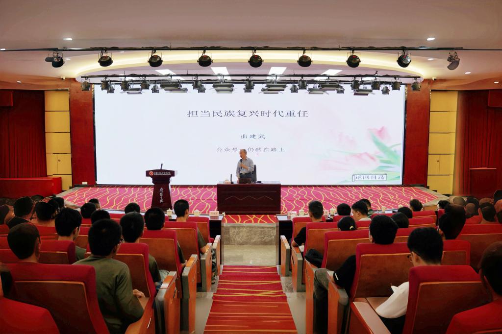报告会上,曲建武教授围绕《担当民族复兴时代重任》主题,以深厚的理论积淀、鲜活的案例和四十余年坚守思政教育一线实践经历为中飞院师生带来了一堂生动、深刻的思想政治课。他从热爱祖国、热爱中国共产党、坚定理想信念、提升思想力、为实现中国梦刻苦学习、培养刚毅坚卓的品格、强身健体等方面为学生成长成才锚定坐标,生动讲述了当代大学生的使命与责任。他表示大学是人生中最宝贵的时光,勉励同学们要坚定理想信念,塑造正确“三观”,立报国强国之志,将个人理想融入国家发展大局。要珍惜大学美好时光,强健体魄,远离不良习惯,担负起时代的重任,在青春的赛道上跑出当代青年的最好成绩。