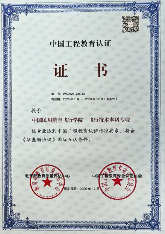 在“十四五”收官、“十五五”开局之际,飞行技术专业顺利通过工程教育认证,这是对本专业人才培养质量和国际实质等效性的权威认定。未来,中飞院将持续深化教育教学综合改革,不断完善人才培养体系,为民航业输送更多理论功底深、实践能力强、职业素养高的卓越飞行人才。