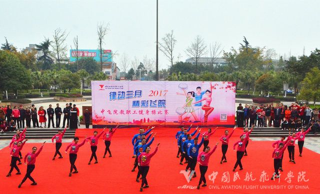 本网讯 殷东来 郭馨羽 报道:由校工会组织的三八妇女节系列活动之一“教职工健身操比赛”于3月29日下午在校图书馆广场举行。十八支参赛队伍分别来自新津分院、广汉分院、遂宁分院、飞机修理厂、院直机关(两个队)、后勤服务总公司、公安局、医院、社科部、空管中心,以及七个二级学院。