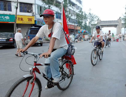 8月4日下午,中国民航飞行学院的四名学子骑着自行车来到全省宣传奥运行的最后一站,万里长江第一城——宜宾。他们从广安出发,经过绵阳、广汉、都江堰、成都、乐山、自贡,怀着“庆奥运、迎圣火、扬飞院、共建和谐四川”这个心愿,历时15天,终于到达了中国宜宾?长江地标广场。