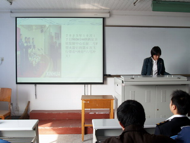 2005年10月28日下午三点,在一教304教室,中国民航飞行学院大学生邓小平理论学习研究会举办本学期第二期时事半月谈——“神六——中国向太空迈出的又一步” ,由航空运输管理学院分会承办。此次活动以“神六”成功发射为中心,贯穿“神舟”号飞船的整个发展历程和中国航天事业的远景规划,纵览世界先进航天技术的发展,对中国的世界航天坐标进行了探讨。邓研会会长、各部门骨干及部分会员到会参加并热烈讨论了相关问题,就自己的观点进行了发言。同学们的博才多学、巧言善辩赢得了此起彼伏的掌声。最后的“神舟趣味问答”更是使整个会场的气氛沸腾,把活动推向了高潮。活动结尾由邓研会会长做了总结。